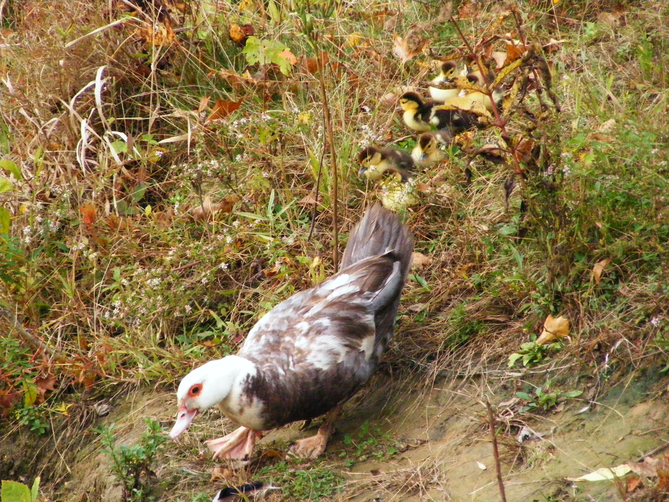 duck and ducklings at the water’s edge in the fall