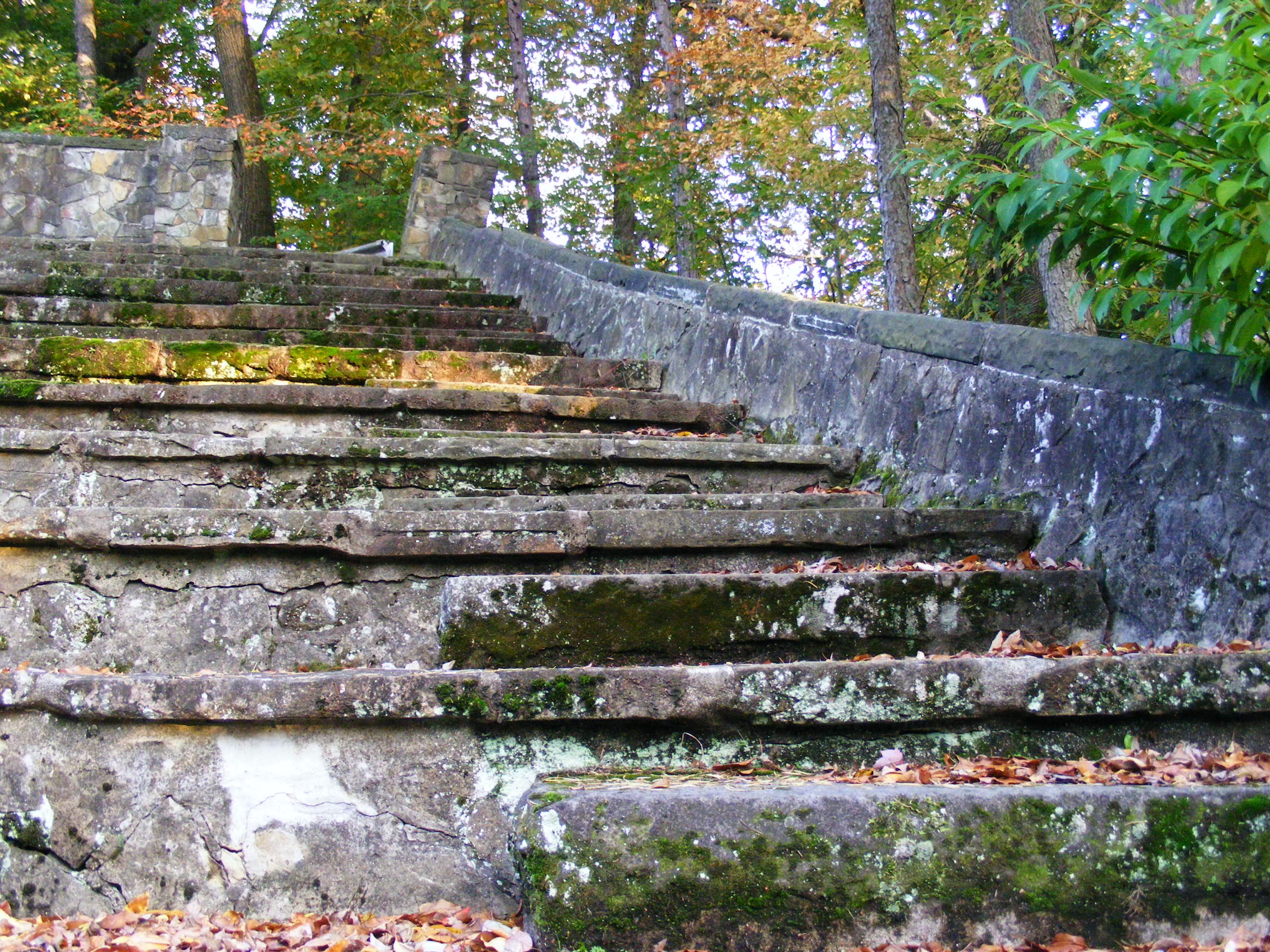 moss on edge of stone amphitheater with fallen leaves