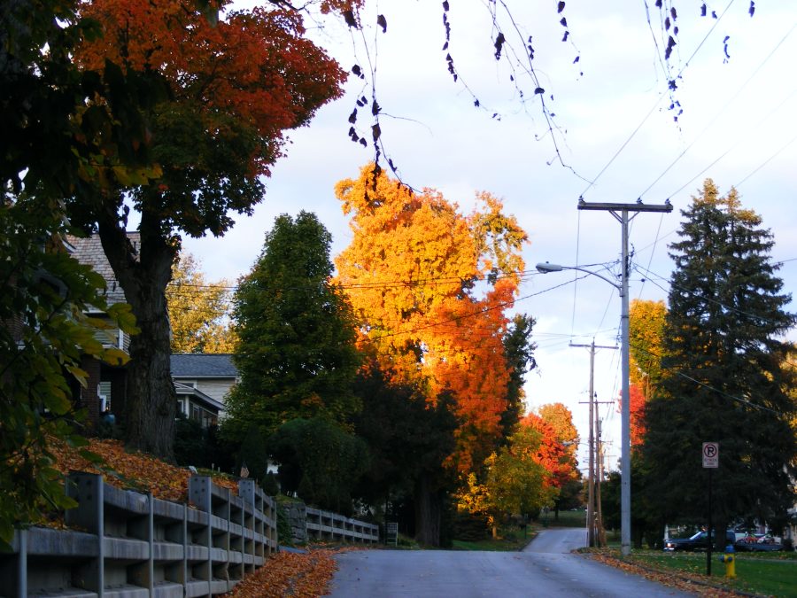 red, yellow, and green trees along a street with a fence