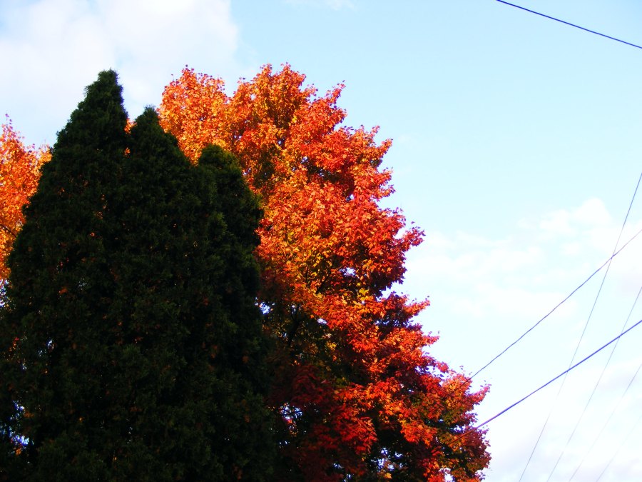 red-orange leaves against the sky
