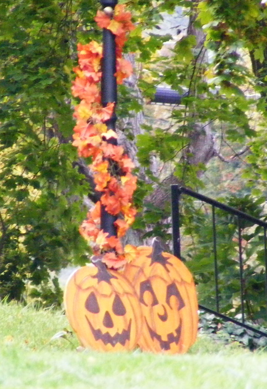 pumpkins next to iron light pole