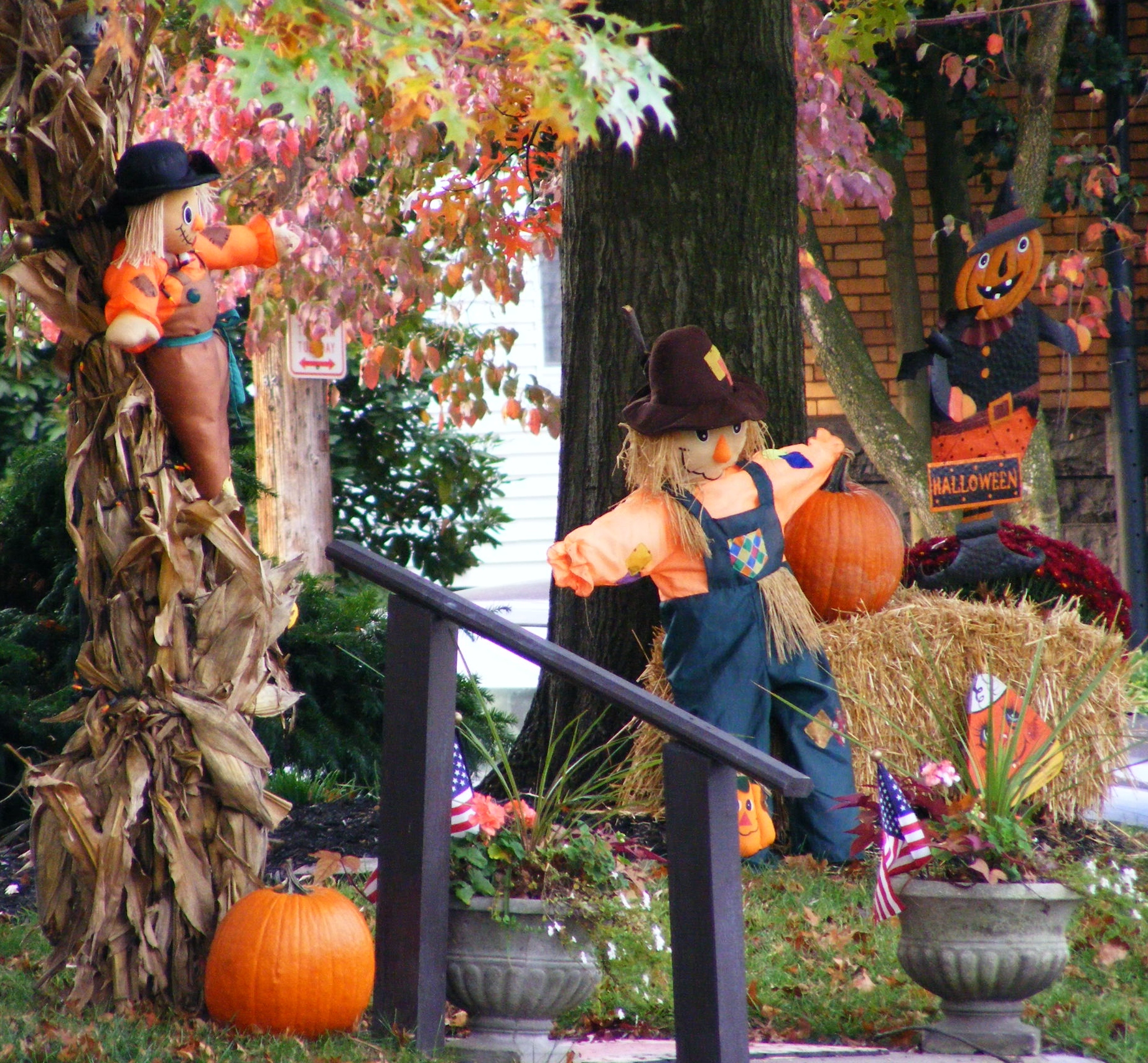 scarecrows, hay bale, cornstalk, pumpkins, candy corn, Halloween decorations