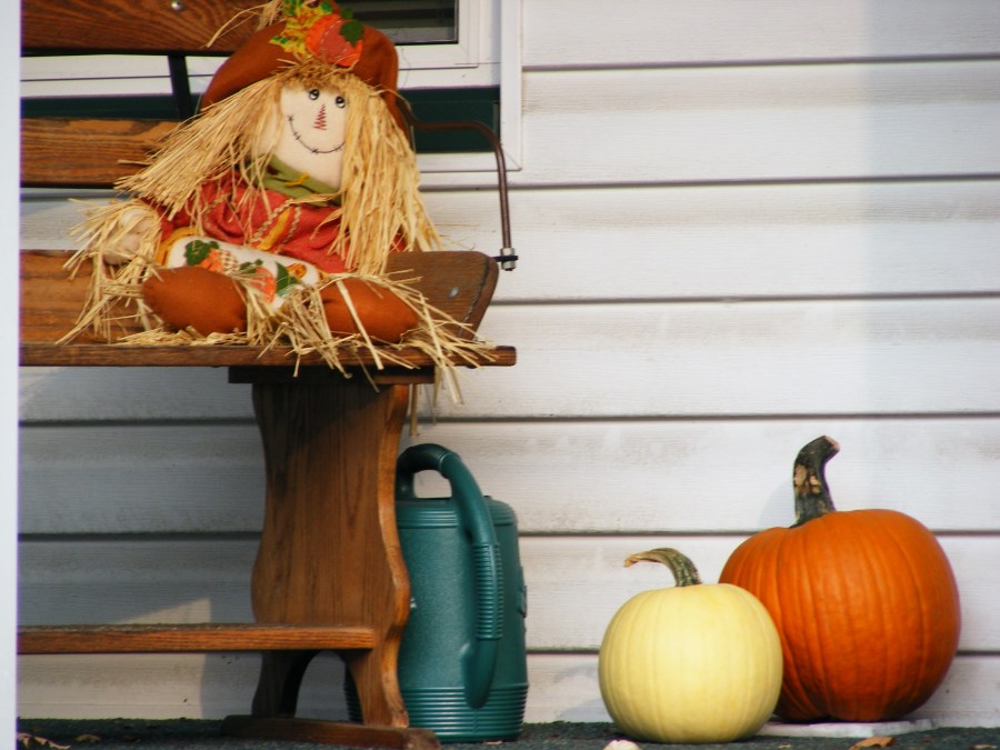 white and orange pumpkins, watering can, scarecrow doll