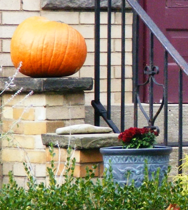 pumpkin with iron railing and burgendy door